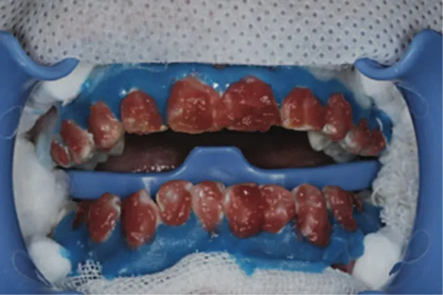 4、微打磨后,利用诊室内漂白剂减轻氟斑牙表面的棕色着色。
