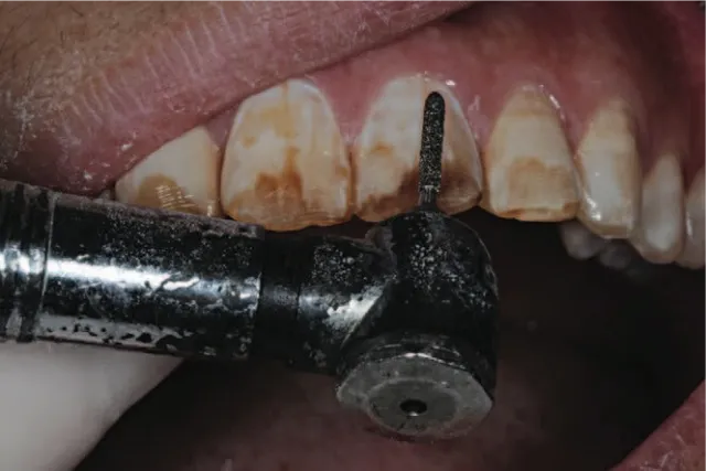 粗打磨主要用于磨除釉质浅层高度着色和存在缺损的氟化釉质。这一步骤可消除釉质内着色,缩短临床治疗时间。有研究表明,25%-33%的釉质厚度减小不会引起临床改变或引起可接受的临床改变。因此,操作良好的粗打磨在治疗重度氟斑牙中是可接受的治疗方法。