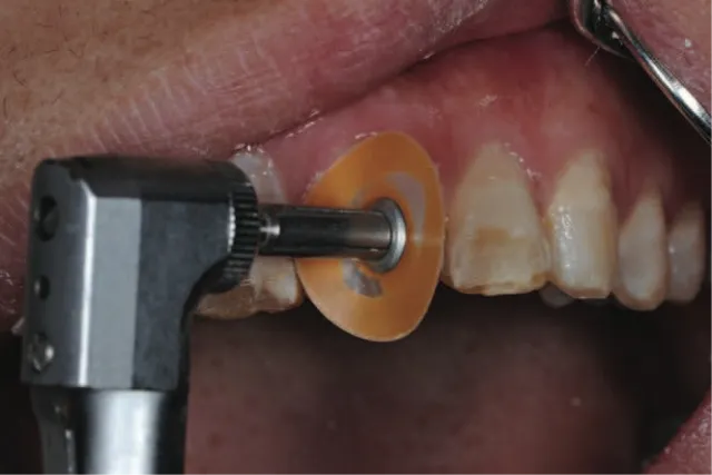 2、利用中-细抛光盘 打磨釉质表面并消除尖锐角。