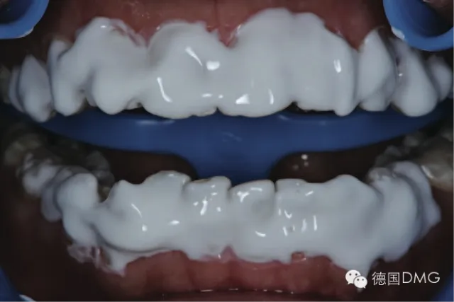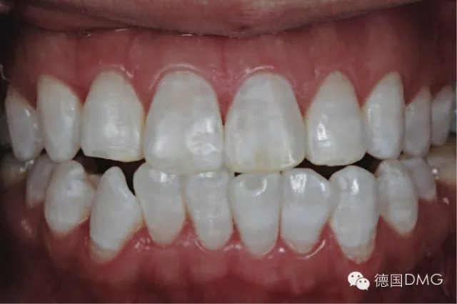 5、由于氟斑牙存在釉质矿化不全等问题,家庭漂白两周后,使用标准的树脂渗透技术 (Icon, DMG Products, Hamburg. Germany) 来预防釉质龋。最后,彻底改变患者的前牙美学,并在一年后仍保持稳定