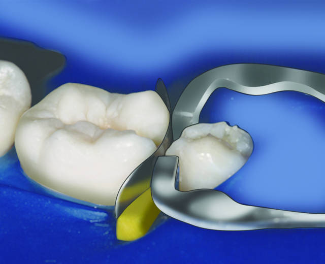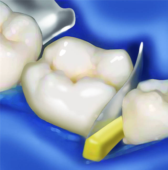 6.用邻间楔或者牙胶尖固定成型片,密合龈缘。