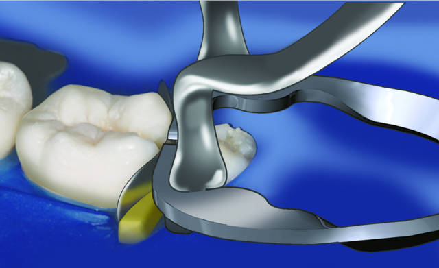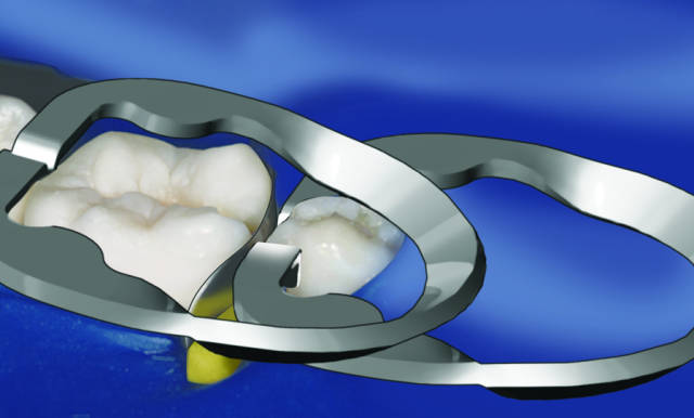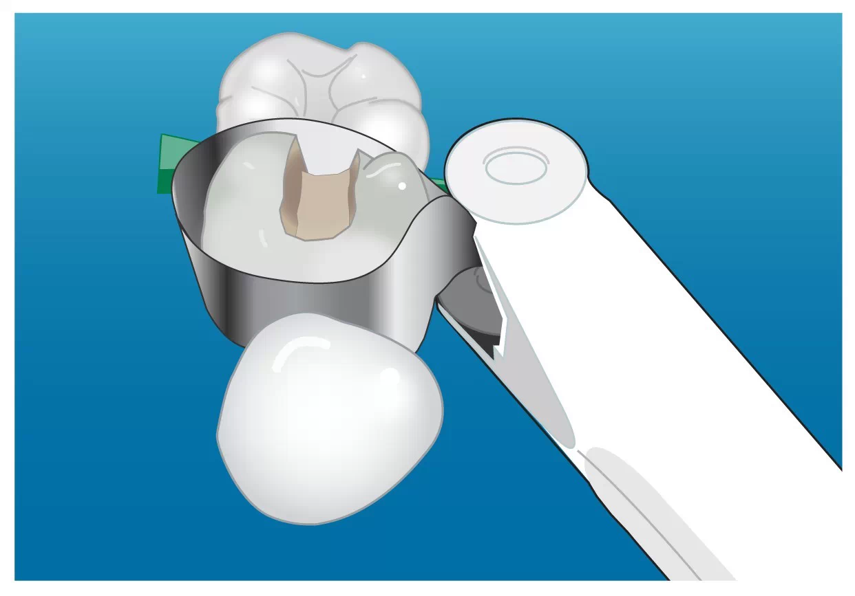 5.放置成型片,用持针器或者镊子来夹持成型片,调整其位置,使其与牙体紧密贴合。