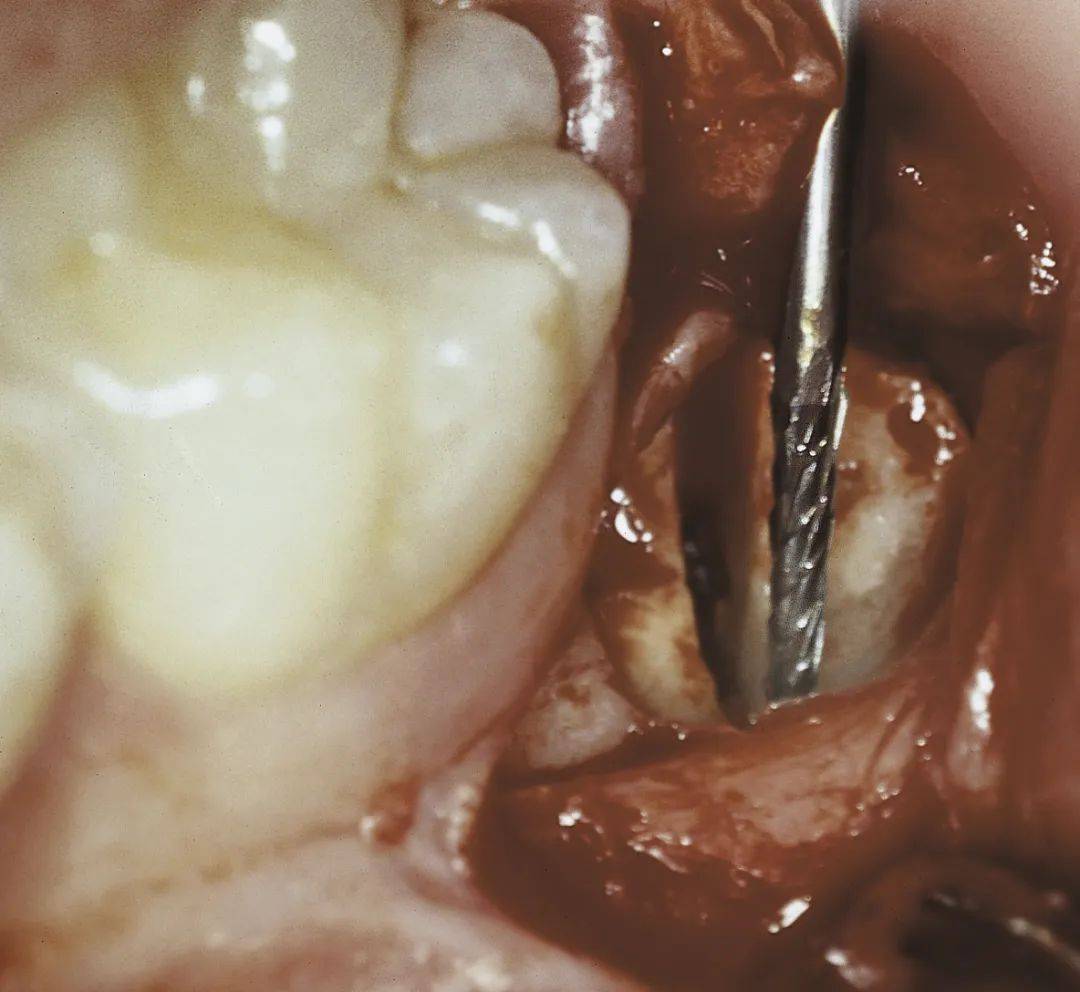 步骤一(增隙):使用H254LE (31mm),利用其长度优势和锋利刃口,在牙冠与远中骨之间建立间隙。