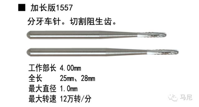 通过将患牙牙体组织恰当分割,化整为零,从而解除患牙拔除时的各方阻力,使操作尽量在患牙内进行,是微创拔牙术的精髓,也是最能体现医生技术水平的关键环节。分牙的目的是为了减小患牙冠和(或)根部骨阻力或解除邻牙的阻力分牙,可包括截冠、分根以及在患牙牙体组织内任意分块切割,适用于各种复杂牙、埋伏牙,尤其是患牙有两根及两根以上,根分叉较大而难以拔除的牙齿。通过分切牙齿,使多根牙转化为单根牙,大牙变小牙而轻松解除阻力,术中准确的分牙设计和操作是将牙齿又快又好地拔除的关键。不同类型的牙齿,分牙方法也是不同的,总体来说以分割块数和次数越少越好,以最小和最少的分割方式进行,有利于减少操作时间、减少创伤和降低并发症。推荐使用马尼加长版1557。加长版1557是外科用长柄车针,全长有25mm和28mm,刃部设计采取十字切割,高效安全,不易折断。
