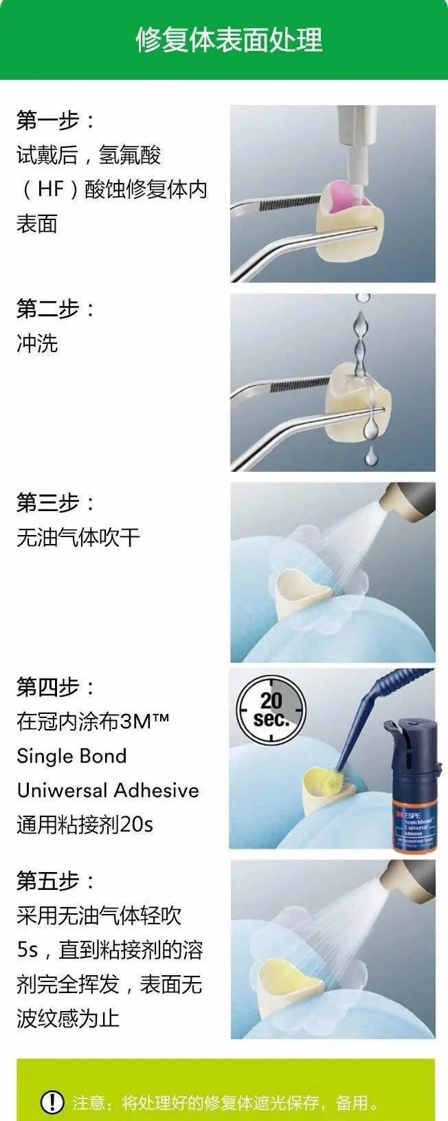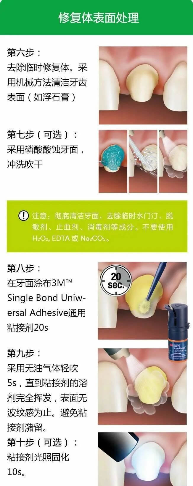 RelyX™ Ultimate水门汀和Single Bond Universal 粘结剂(3M)共同使用时,可以得到完美的粘结表现,Single Bond Universal不但可以全酸蚀和自酸蚀技术通用,而且可以作为大部分修复体表面的处理剂。RelyX™ Ultimate水门汀含有SingleBond Universal的暗固化激活剂,所以两者合用时不需要额外的激活剂,同时减少了操作步骤。仅两组分,更少的步骤,带给临床的不仅仅是操作更简单,更重要的是减少了出错的几率,还能减少您的储存空间。