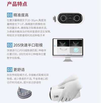 位置测量精度优于20-30um,角度测量精度优于1.0,高精度的图像检测和测量技术,确保每次取模准确无误,为患者的精准治疗和修复提供坚实保障帮助无牙领患者顺利完成种植手术